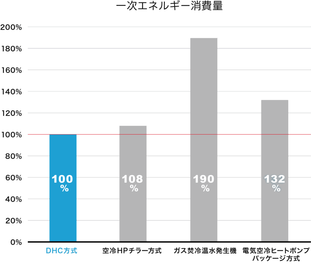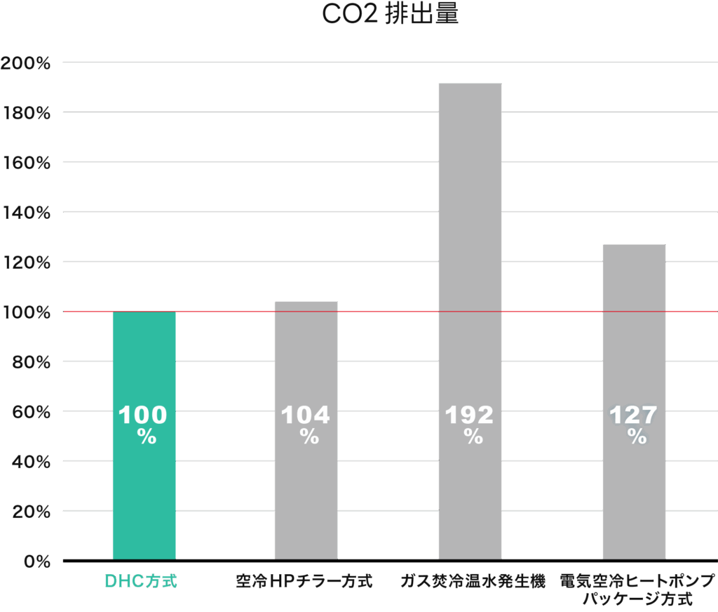 環境性を示す指標である一次エネルギー消費量やCO2排出量は、地域冷暖房の方が優れています。