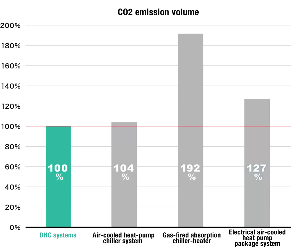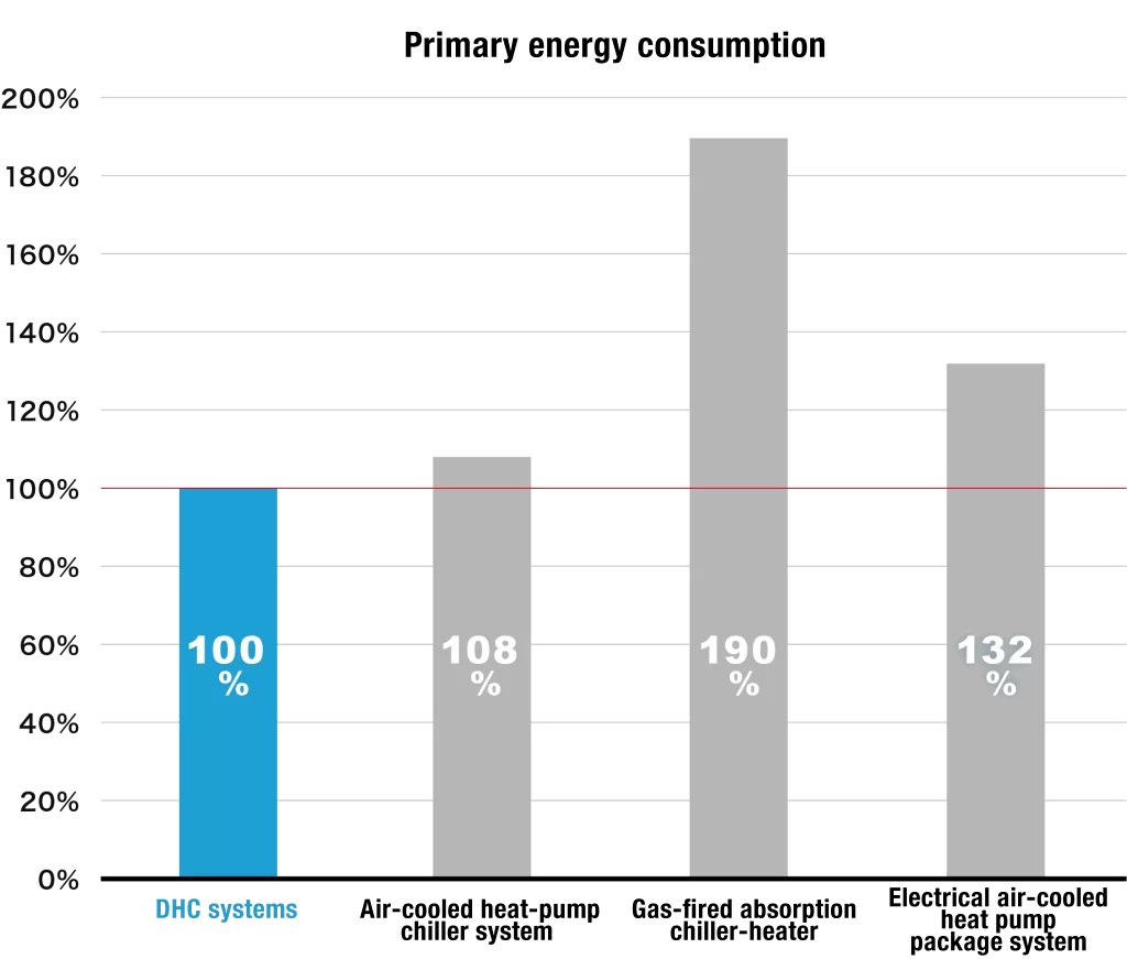 DHC delivers outstanding results in two indexes of environmental performance: primary energy consumption and CO2 emission volume.