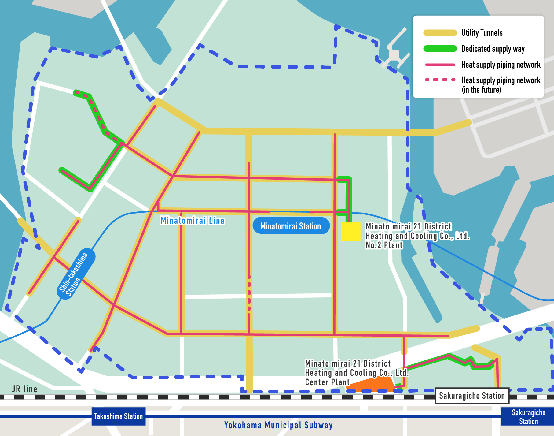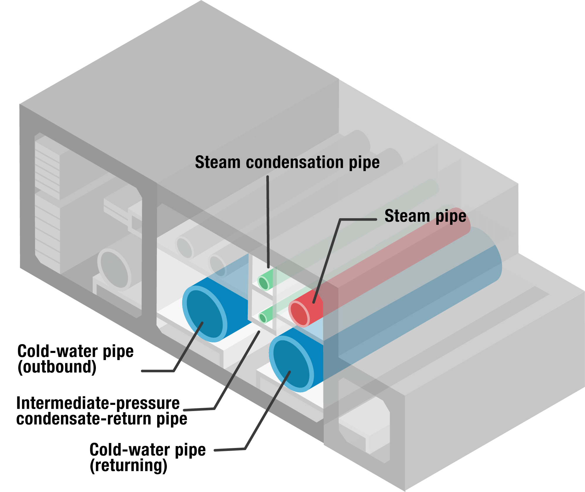 Cold water and steam produced in the plants pass through the heating and cooling supply pipes to each building and return to the plants after use.
