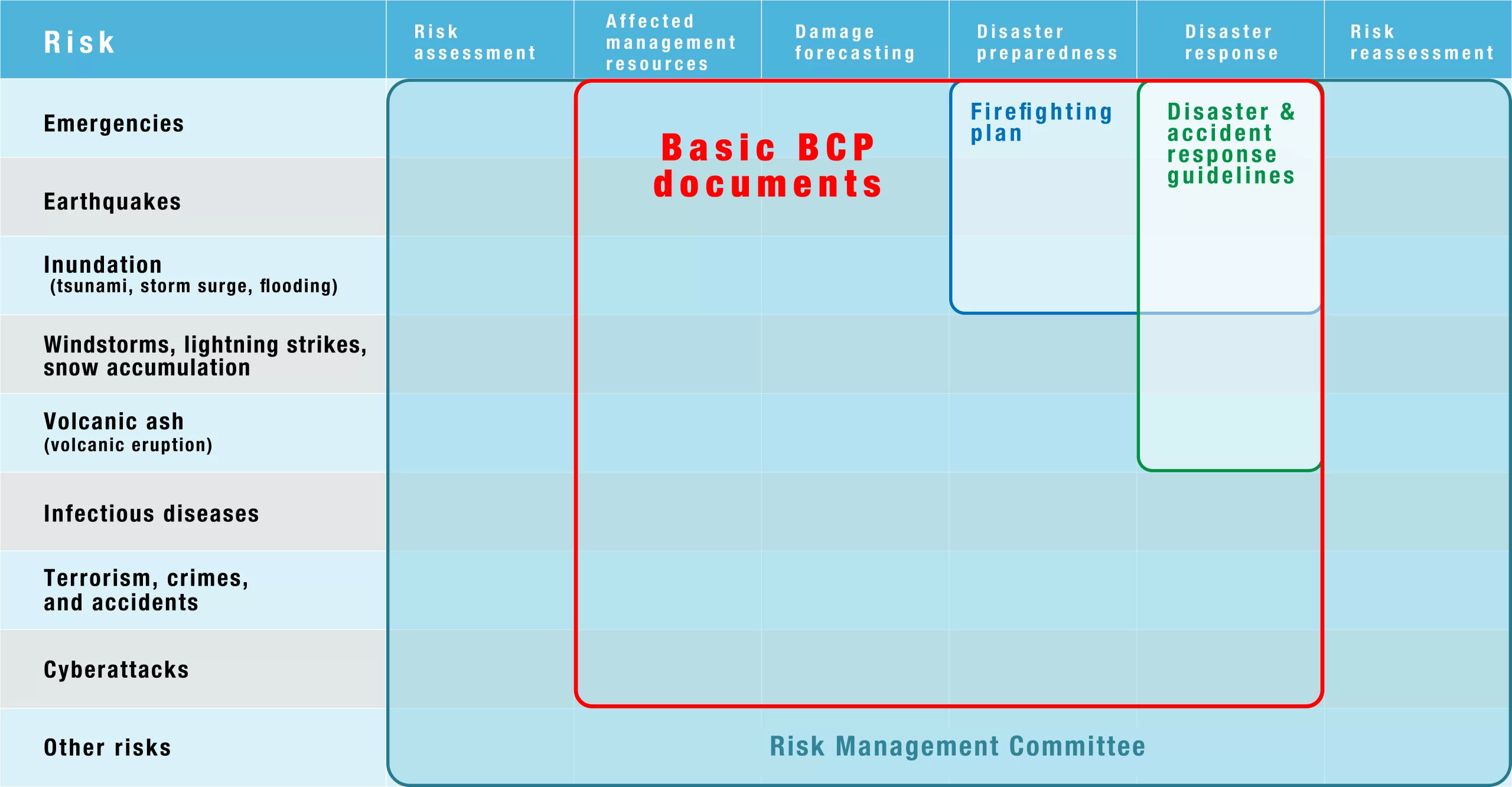 We draw up a business continuity plan (BCP) based on the risks identified by the committee and the countermeasures it formulates. The BCP estimates the damage expected in the event of an earthquake, tsunami or other disaster and sets forth measures to prepare for and respond to such disasters.