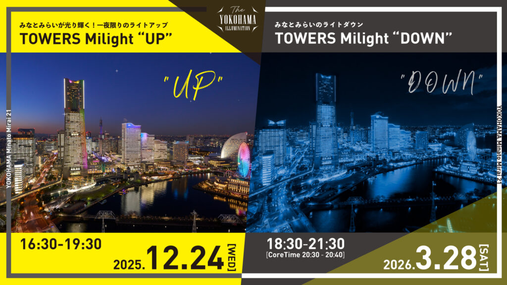 当社は、一般社団法人横浜みなとみらい21が主催する「TOWERS Milight“UP / DOWN”」に参加します。こちらのイベントは、環境への配慮として、横浜市が再生可能エネルギーに関する連携協定を締結した茨城県神栖市などの風力発電所及び太陽光発電所等で作られた電力のFIT非化石証書を当社から購入し、開催されます。