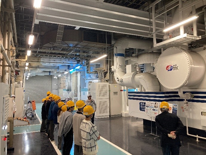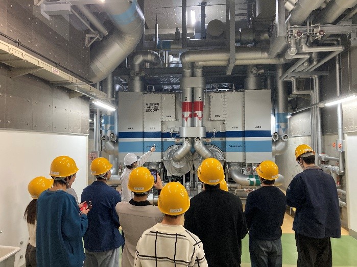 プラント見学では、当社従業員から、プラントリニューアルなどの省エネルギー化の取り組みや、熱の脱炭素化に向けた当社の取り組みを紹介したほか、世界最大級のターボ冷凍機や潜熱蓄熱システムなどの見学を行いました。